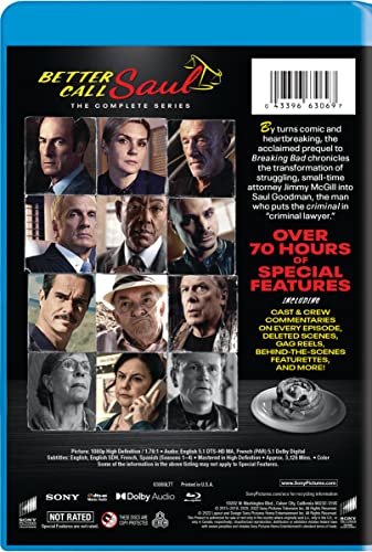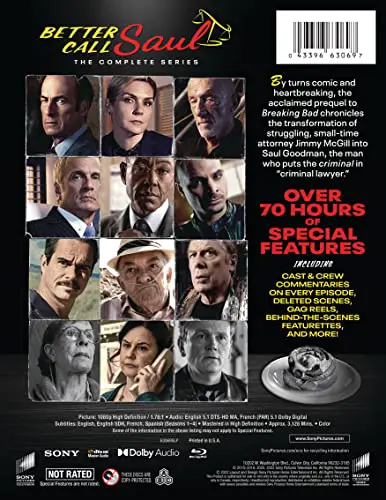 Bob Odenkirk reprises his “Breaking Bad” role as low-rent lawyer Saul Goodman in this spin-off/prequel series. Set in 2002, the show follows Saul-who’s still using his given name of Jimmy McGill-as he gets involved in a series of morally questionable cases and perpetuates the occasional scam. Jonathan Banks also returns as ex-cop-turned-private eye Mike Ehrmantraut. With Rhea Seehorn, Patrick Fabian, Michael Mando, and Michael McKean.63 episodes on 19 discs. 52 hrs. Widescreen (Enhanced); Soundtracks: English Dolby Digital 5.1, French; Subtitles: English, Spanish, French.
