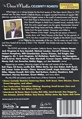 This 8-DVD set includes 24 complete Celebrity Roasts and features dozens of stars from the day, such as Valerie Harper, Jack Klugman, Tony Randall, Michael Landon, Carroll O Connor, Sen. Hubert Humphrey, Wilt Chamberlain, Danny Thomas, Ted Knight, Dan Haggerty, Mr. T, Ed McMahon, Redd Foxx, Joe Garagiola, Evel Knievel, Hank Aaron, Peter Marshall, Truman Capote, William Conrad, Monty Hall, Leo Durocher, Bobby Riggs, Joe Namath, Bob Hope, Ed Asner, Lucille Ball, Georgia Engel, Milton Berle, Dr. Joyce Brothers, Zsa Zsa Gabor, Ruth Buzzi, Sid Caesar, Foster Brooks, Charo, Howard Cosell, Angie Dickinson, Phyllis Diller, Nipsey Russell, Lorne Greene, William Holden, Gabe Kaplan, Art Linkletter, Rich Little, Paul Lynde, Scatman Crothers, Dick Martin, Red Buttons, Audrey Meadows, Bob Newhart, LaWanda Page, Isabel Sanford, Harvey Korman, Soupy Sales, Jimmie Walker, Orson Welles and many more.