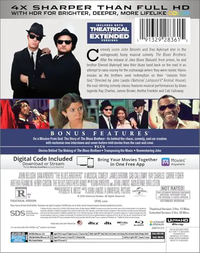 - Includes 4K UHD, Blu-ray and a digital copy of The Blues Brothers (Subject to expiration. Go to NBCUCodes.com for details.)