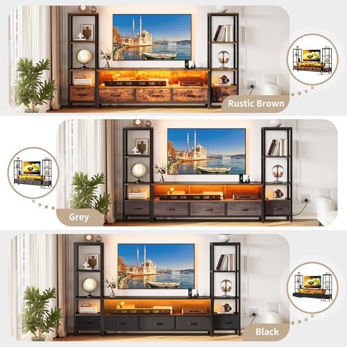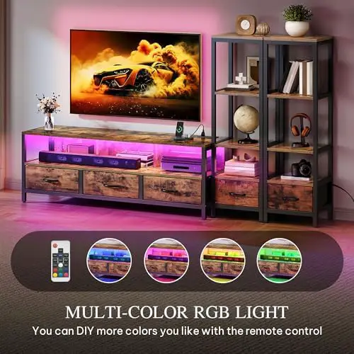 Advanced Features: Packed with 2 AC outlets and 2 USB ports, our tv entertainment center with storage effortlessly powers your TV and gadgets. Plus, the built-in multi-color LED lighting, controlled by remote, transforms your space with vibrant ambiance